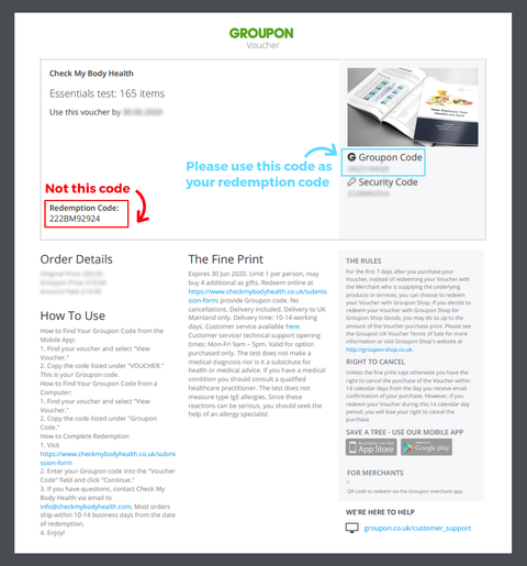 If you cannot find the answer you need please talk to us on Livechat or email us at grouponsupport@checkmybodyhealth.com